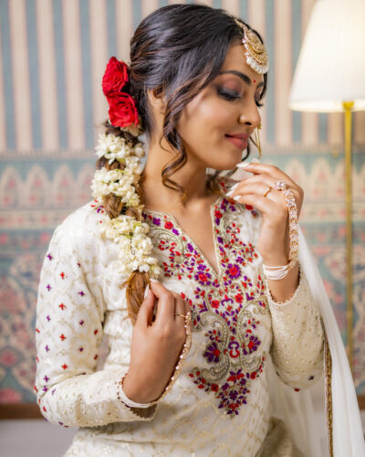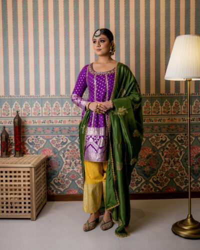 Our most beautiful purple Anarkali gown from Aahava’s Banarsi collection is a stunning piece, featuring intricate zardozi sequins and moti detailing at the neckline. The bottom is adorned with thick embroidery laces in an antique finish, while the dupatta showcases overall buttis and elegantly finished borders. This exquisite gown is one of our best sellers, embodying timeless elegance and sophistication.