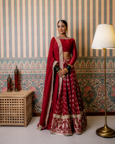 Our classic maroon Banarasi Chanderi lehenga is a timeless piece, paired with a plain self-organza dupatta adorned with pearl and stone borders. The blouse features exquisite zardozi and pearl hand embroidery, adding a touch of elegance. This beautiful dress is a must-have for every woman’s wardrobe, perfect for any special occasion.