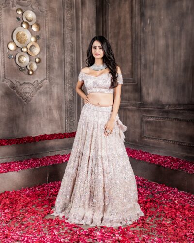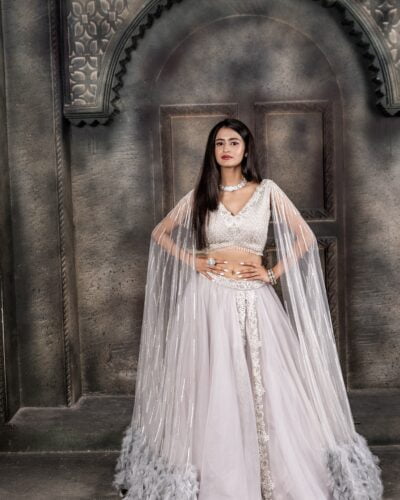 Deck up in this dazzling fusion of tradition and modernity, bestowing a distinct charm that’s sure to turn heads in the crowd. What sets this creation apart is the meticulous floral cutwork on the dupatta and the belt, adding a whimsical pop that enchants the wearer. These delicate blossoms create a dance of intricacy, while the silver raw silk layer gracing the lehenga adds a stroke of brilliance through its contrasting texture.