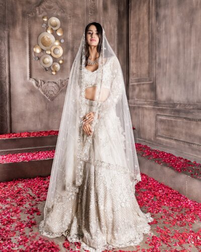 Ethereal threads of organza and silk come alive in our three-layered skirt, a mesmerizing symphony with every step. Adorned with meticulously embroidered florals, each petal a whisper of charm, the front panel spins its own narrative. The silver pearl heavy-embroidered blouse is a crown jewel of artistry, glistening pearls orchestrating a captivating interplay of radiance. Completing this opulent ensemble, the heavy-embroidered dupatta cascades like a waterfall of dreams from your shoulders, an invitation to conversation, a glimpse of your tale. Elegance and whimsy entwine, transforming your attire into a celebration of cherished moments.